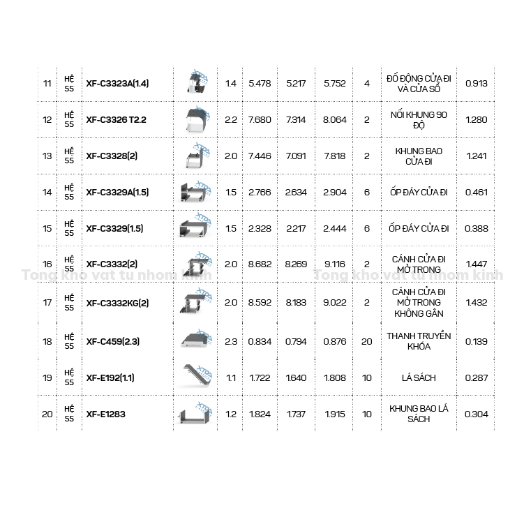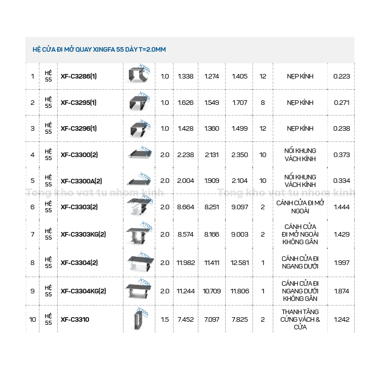 HỆ CỬA ĐI MỞ QUAY XINGFA 55 DÀY T=2.0MM