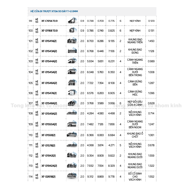 HỆ CỬA ĐI TRƯỢT XTDA 93 DÀY T=2.0MM