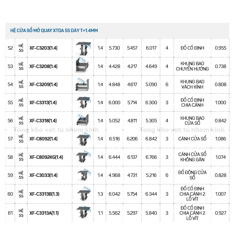 HỆ CỬA SỔ MỞ QUAY XTDA 55 DÀY T=1.4MM