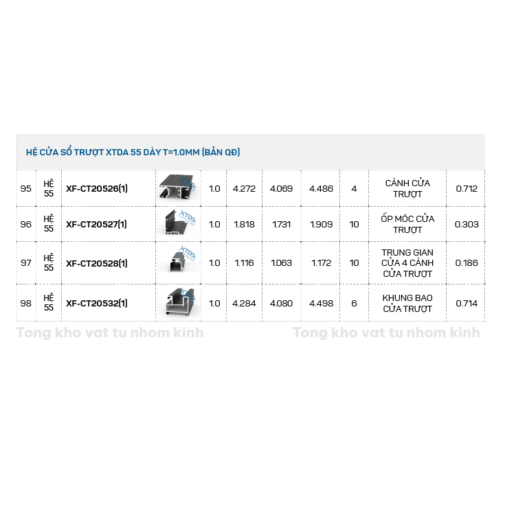 Đặt mua HỆ CỬA SỔ TRƯỢT XTDA 55 DÀY T=1.0MM (BẢN QĐ)