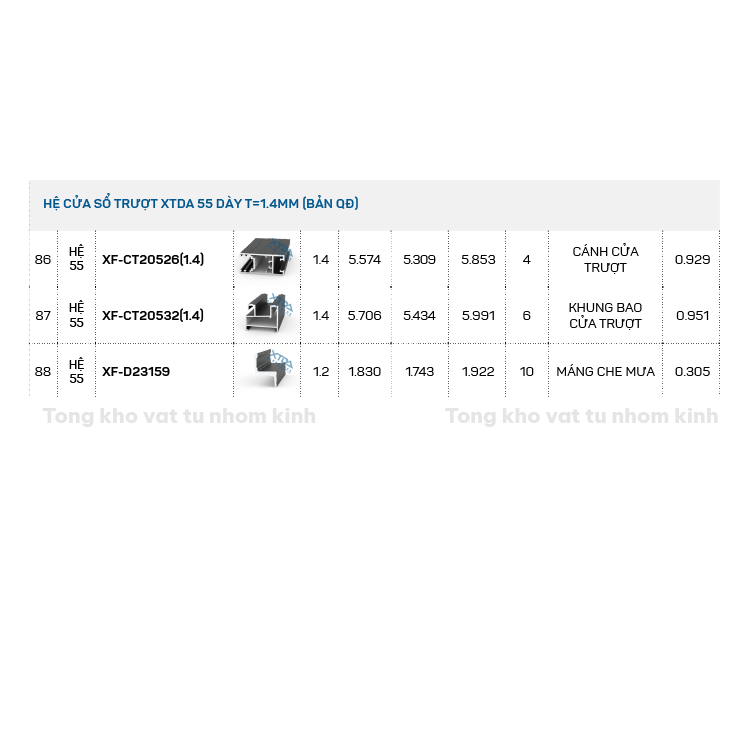 Đặt mua HỆ CỬA SỔ TRƯỢT XTDA 55 DÀY T=1.4MM (BẢN QĐ)